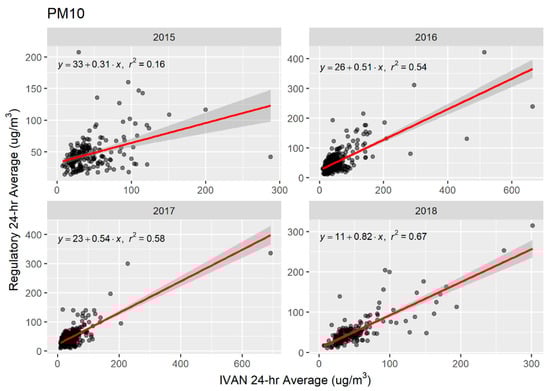 Scatter plots and OLS linear regression lines for PM2.5 and PM10 are shown in Figure 2 and Figure 3, respectively. Network and regulatory mean daily averages were significantly associated for both PM2.5 and PM10 across all years. Linear associations were weak to moderate, as indicated by r-squared values, and robust estimates of standard error were low (Table 3). For PM2.5, regression lines show that Network monitors are, on average, predicting similar mean 24-h averages as the regulatory monitors. For PM10, regression lines show that predicted mean 24-h averages for Network monitors are similar to those of the regulatory monitors when estimates are less than 100 μg/m3. However, Network monitors are predicted to have higher mean 24-h averages for measures of PM10 in the range of 200–600 μg/m3 compared to predicted values for regulatory monitors.