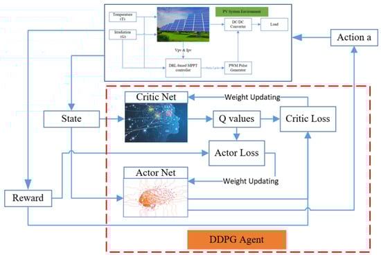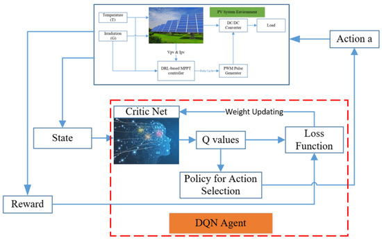 The recent development of machine learning leads to an integration of reinforcement learning and deep learning, named as deep reinforcement learning (DRL), which is considered as a powerful and potential tool to deal with the optimization control problem [34,35,36]. The successful performance of the DRL method in playing Atari and Go games is described in the study [37]. DRL is a powerful method for handling complex control problems with large state spaces. The advantage of DRL is that it can manage the problem with continuous state and action spaces. To date, DRL has been successfully applied to several fields, including games [37], robotics [35,38], natural language processing [39], computer vision [38], healthcare [40], smart grid [41], etc. Zhang [42] has defined a brief overview of DRL for the power system. A similar concept with deep reinforcement learning has been developed for MPPT control of the wind energy conversion system, in which a neural network is used as a function approximation to replace the Q-value table [43,44].