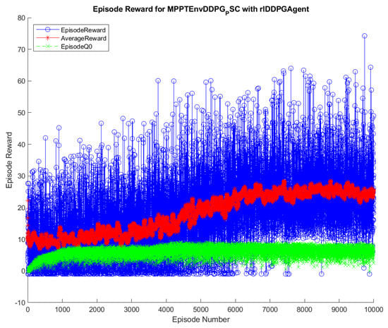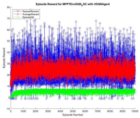 The simulation was implemented in Matlab/Simulink through the Reinforcement Learning Toolbox. Based on random initial conditions, including solar irradiation, temperature, and the initial duty cycle, the system was operated with a total time of 0.5 s in an episode and 0.01 s time step. The simulation was conducted within 1000 episodes for both methods. The network layout and number of layers used in this study are recommended by Mathworks. The deep neural networks as shown in Supplementary Figure S8, used to approximate the critic for both DQN and DDPG, have the same setting. It is used for the critic net to approximate the action-value function. Moreover, Supplementary Figure S9 indicated the actor net, which is used to select the action that maximizes the discounted reward. To multiply the input by a weight matrix, a linear function is employed to a fully connected layer. ReLu layer is the most popular activation function in deep neural networks, which employs the rectified linear unit activation function. The hyperbolic tangent activation function is used to constraint the output action to the range (−1,1), marked as a tanh layer. Then a linear layer is applied to scale up the output from the tanh layer to the desired magnitude. In addition, the Adam optimization method is applied for the training of neural networks. The learning rate () is defined with the value of 0.001 for both critic networks in two proposed algorithms, while the learning rate of actor network is 0.0001. The action space of DQN is [−0.03, −0.01, −0.005, −0.001, 0, 0.001, 0.005, 0.01, 0.03], while that of DDPG is the range (−0.03,0.03). Moreover, the step of duty cycle used in the P&O method is equal to the value of 0.03. Finally, the other setting parameters are indicated in Table 2.