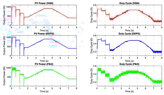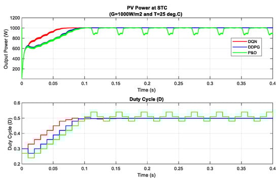 In the following part, the first set of simulations under standard test condition (STC, G = 1000 and T = 15 °C) are carried out to validate the implementation and evaluate the DRL-based MPPT controllers under different operating conditions. In this scenario, the performances of two proposed methods are tested under a standardized operating condition, as well as being compared with traditional MPP tracking method P&O. The simulated results of this scenario are illustrated in Figure 6. As can be seen in the figure, the MPP is tracked after just about 0.07 s for the DQN-based method, while DDPG and P&O almost get the same tracking speed. On the other hand, DQN and DDPG methods are more stable. As the P&O method has oscillation with high magnitude, the two proposed methods perform with a constant duty cycle at about 0.5, which results in the low oscillation of the P–V curve. Based on the results in this scenario, the power tracking efficiency of DQN and DDPG methods increases with the values of about 5.83% and 3.21%, respectively, when compared to that of the P&O method.