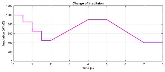 In this part, the test for the two proposed DRL-based methods under a constant temperature with the change of irradiation is carried out. Figure 7 shows the input condition for this scenario testing, including step change, gradually increasing and decreasing the irradiation. The performances of the three methods are illustrated in Figure 8. All the plots in the left-hand side indicate the PV output power while the plots in the right-hand side describe the control signal of the duty cycle. As can be seen from the graph, the duty cycle of the P&O method changes with higher magnitudes, resulting in higher oscillation around the MPP when compared with the other two methods. Based on the step change of irradiation, the responses of the three methods are almost the same. However, the DQN and DDPG methods perform more stable and smoother, resulting in the thinner PV and duty cycle curves. According to the simulated results in this scenario, the power tracking efficiency of DQN and DDPG increases with the values of about 1.24% and 0.96%, respectively, when compared with the P&O method.