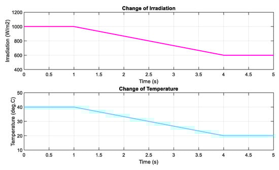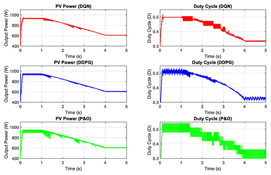 Next, the DRL-based methods are tested under the change of both irradiation and temperature as shown in Figure 11. The operating condition starts with 1000 and gradually decreases to a value of 600 , while the temperature is set to 40 °C at the beginning and also declines to a value of 20 °C at the end. The performances of the three proposed methods are demonstrated in Figure 12. As shown in the graph, the red line is for the DQN method, while the blue line and green lines indicate the DDPG and P&O, respectively. The graphs on the left-hand side illustrate the output power while the right-hand side graphs show the duty cycle. Under the step change of weather conditions, as shown in the first second and the last second of the graphs, the DQN method has the best performance, resulting in the lowest oscillation of the duty cycle and output power. It is followed by the DDPG and P&O, respectively. However, under the gradual change of both temperature and irradiation, as shown from 1–4 s, DDPG follows the power path better than the other methods, so its duty cycle curve is less oscillating. Thus, the DDPG method has the highest efficiency, followed by DQN and P&O methods. Compared to the P&O method, the power tracking efficiency of the DDPG method increases by 1.62%, while that of the DQN method is just about 1.58%.