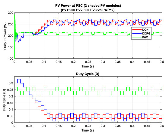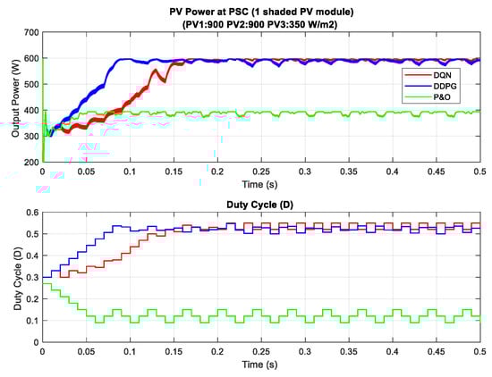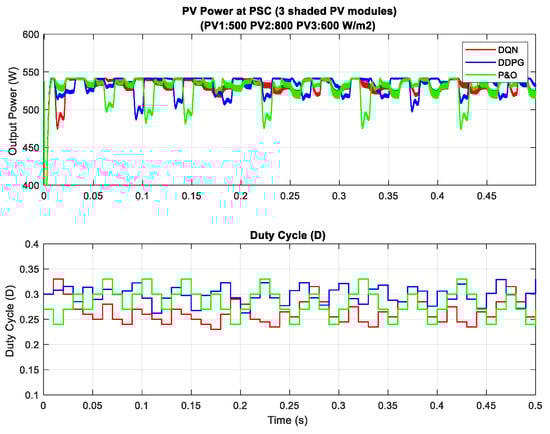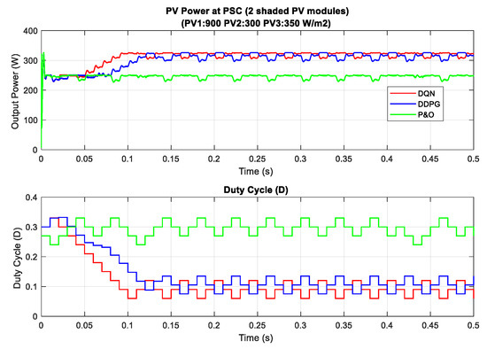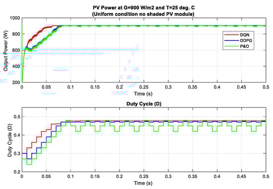 In this section, different partial shading conditions are applied for the testing and validation of the proposed methods. There are three PV modules in the PV system and they are connected in series. Firstly, a uniform weather condition at 900 is applied and the tracking results are displayed in Figure 13. Then, the scenario with one shaded PV module is tested, followed by two shaded PV modules and three shaded PV modules. Under this uniform condition, the theoretical value of the MPP is equal to about 902.8 W. As can be seen from the graph, the DQN method, marked as the red line, has the best tracking speed with the lowest oscillation around the MPP, resulting in the flat duty cycle curve. In contrast, the P&O method, marked as the green line has the poorest performance with the highest oscillation of the duty cycle. When compared to the P&O method in terms of power tracking efficiency, the DQN is higher with a 3.35% increase, while that of the DDPG method is just 3.17%.