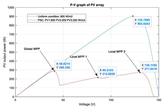 A PV array consists of several PV modules, connected in series or parallel to get the desired output voltage and current. Two PV modules in series mean that there are a maximum two peaks along the P–V curve under PSC. Similarly, five PV modules in series could have a maximum five peaks. The proposed method in this study can be applied for different PV systems. However, for the simplicity and clear distinction between a global maximum power point (MPP) and local MPPs, three PV modules in series are used for the simulation. Supplementary Figure S3 shows the PV array used for the simulation in this study. As shown in the diagram, bypass diodes and a blocking diode are used to protect PV modules from self-heating under partial shading conditions (PSCs) [2,3]. Here, if more than one PV module is shaded by pole shadows, building shadows, and bird droppings, it causes the partial shading over a PV string. Here, it acts as a load rather than a power source. The hot spots phenomenon will damage the shaded PV module in long term conditions [14,46,47]. Hence, a bypass diode is added in parallel to protect the PV system and eliminates thermal stress happening on PV modules.
