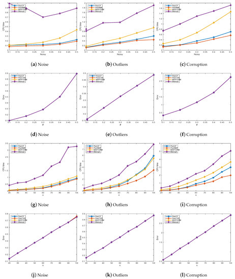 In all test examples, we randomly generate the sparse representation X by and the dictionary by randomly selecting a point on Stiefel manifold. Then, the original data matrix Y is constructed by . To test the performance of all compared algorithms, we add different types of noise to . We first fix the level of noise and choose n from 20 to 100. Then, we test the performance of compared algorithms with different types of noisy while fix . In our numerical tests, the “Noise” denotes the Gaussian Noise, where Y is constructed by . Besides, the term “Outliers” denotes the Gaussian outliers, where . Additionally, the term “Corruption” refers to the Gaussian corruption to , which is achieved by . Besides, the term ’CPU time’ denotes the averaged run-time, while the term ’Error’ denotes the , where denotes the final output of all the compared algorithm.