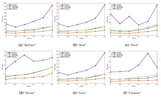 The CPU time of PenCF, PenNMF, MSP/GPM, and Manopt on computing the dictionary. (a) Barbara, ; (b) Boat, ; (c) Duck, ; (d) House, ; (e) Lena, ; (f) Chateau, .