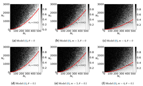 In this subsection, we first verify the recovery property of our proposed model (8), which is a special case of (1) by fixing . We first compare the distance between global minimizer of (8) and the ground-truth for DPCP problem. We first fix and randomly select . Then, we randomly generate inliers in the hyperplane whose normal vector is . Besides, we randomly generate outliers in following Gaussian distribution. Additionally, the data is corrupted by Gaussian noise by adding to Y. Then, we normalize each sample in Y. The range of is , whereas the range of is . We run each test problem for 5 instances. Moreover, in each instance, we run DPCP-PSGM to solve (4) and PenNMF to solve (8) with and 4, and get the solution for each model. We plot the principal angle between and in Figure 3. From Figure 3a,b we can conclude that (4) can tolerate outliers while achieve exact recovery, which coincides the theoretical results presented in [32]. For model (8), numerical experiments do not show the exact recovery ability of (8) for and 4. However, with some tolerance on the principal angle, we also observe that (4) can tolerate outliers. Moreover, we conclude that with , (8) has better ability to recover the normal vector than . As a result, in the rest of this subsection, we only test (8) with . In addition, we analyze the number of successfully recovered instances, where the is less than or . The results are presented in Figure 4. From Figure 4, we can conclude that, with tolerance on the errors, the -norm maximization model can successfully recover the normal vector. Moreover, in model (8), has better performance than , which coincides with the numerical experiments in [18]. Therefore, when applying -norm maximization model to solving the DPCP problems, we suggest to choose in (8).