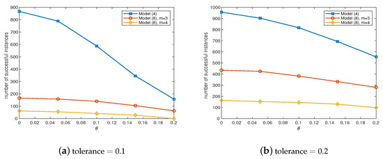 A comparison on the number of successfully recovered instances on the different level of noise. (a) is less than ; (b) is less than .