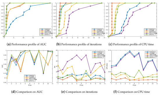 A comparison between PenNMF, MSP, DPCP-PSGM, DPCP-D, and Random Sampling and Consensus (RANSAC). (a)–(c) performance profile [41] of AUC, iterations and CPU time; (d)–(f) the numerical results of AUC, iterations and CPU time.