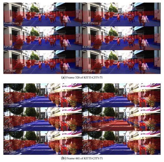 Illustrations to some results in our numerical tests, with inliers in blue and outliers in red. (a) Frame 328 from KITTI-CITY-71, ; (b) Frame 441 from KITTI-CITY-71, . Inliers/outliers are detected by using a ground-truth thresholding on the distance to the hyperplane recovered by each compared method. The results are represented by projecting 3D point clouds onto the image.