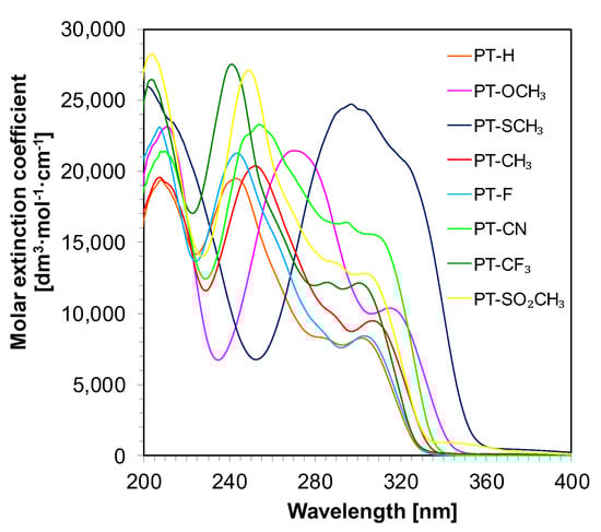 In order to determine the Stokes shift, the emission and excitation spectra of the investigated compounds were measured. The calculated Stokes shift ranged from 2116 cm−1 for 2,6-bis(4-cyanophenyl)pyridine (PT-CN), to 2963 cm−1 for 2,6-bis(4-methylsulphonylphenyl)pyridine (PT-SO2CH3). In addition, compounds with electron-donating substituents, i.e., SCH3, OCH3 and CH3, show a bathochromic shift of both excitation and emission spectra in the direction of longer waves compared to 2,6-diphenylpyridine (PT-H) (Figure 3). For example, the wavelength for the maximum intensity of the emission spectrum for the 2,6-bis-(4-methylsulphanylphenyl)pyridine (PT-SCH3) is located at 374 nm, so it is 33 nm higher than the wavelength for the maximum intensity of the emission spectrum for the basic compound 2,6-diphenylpyridine (PT-H) with maximum emission located at 341 nm. All spectrum data are presented in Table 2 (the visualization of the fluorescence of the pyridines in solution Figure S18).
