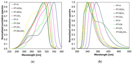 (a) Normalized excitation spectra of the 2,6-diphenylpyridine derivatives in acetonitrile; (b) Normalized emission spectra of the 2,6-diphenylpyridine derivatives in acetonitrile; λex = 290 nm is the excitation wavelength, used to obtain emission spectra.