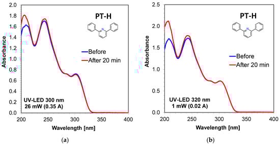 Photolysis of 2,6-diphenylpyridine (PT-H, concentration: 8.83 × 10−5 [mol/dm3]) in ACN during 20 min: (a) under 300 nm (26mW/cm2); (b) under 320 nm (1mW/cm2).