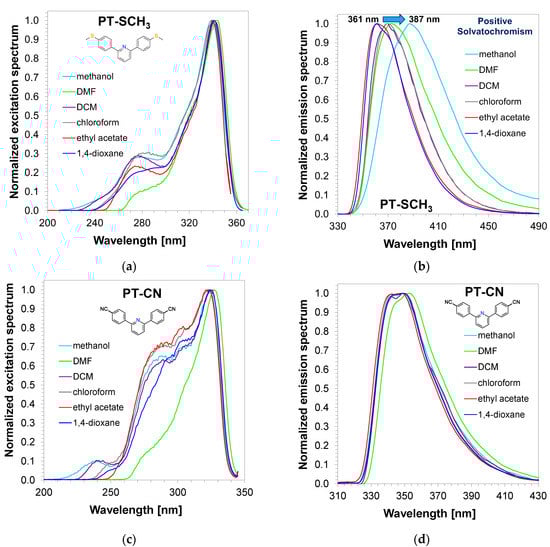 Due to the fact that FPT technology is based on the analysis of changes in the fluorescence sensor emission spectra during the photopolymerization process, it was decided to proceed to the next research stage related to the analysis of the sensitivity of the developed derivatives to changes in environmental polarity. For this purpose, two different types of 2,6-diphenylpyridine derivatives were selected in order to study the effect of changes in solvent polarity on their emission and excitation spectra. The first investigated sensor was 2,6-bis(4-methylsulphanylphenyl)pyridine (PT-SCH3), which has an electron-donating substituent in the diphenylpyridine framework. The second derivative was 2,6-bis(4-cyanophenyl)pyridine (PT-CN) with an electron-withdrawing substituent in its structure. The figures of the emission and excitation spectra of the analysed compounds are presented in Figure 5. In both cases, during changes in the polarities of the solvents, no significant changes of the position of the maximum in their excitation spectra were observed. Nevertheless, this was not the case when the emission spectra of the PT-SCH3 compound were analysed depending on solvent polarity. Examining the data summarised in Table 3 and Figure 5, it was seen that the maximum of fluorescence only changed for the PT-SCH3 derivative. The position of maximum fluorescence intensity ranged from 361 nm to 387 nm and highly depended on the polarity of the solvents. This compound, which has an electron-donating substituent into 2,6-diphenylpyridine moiety, exhibits a shift in emission spectra as solvent polarity increases.