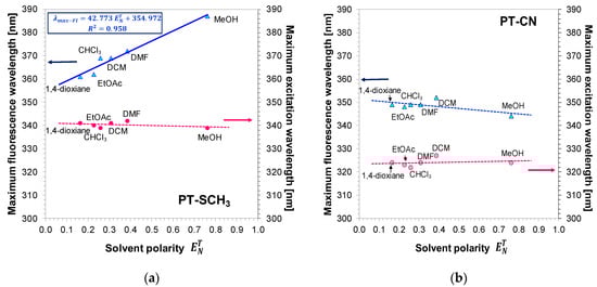 Dependence of the location of the maximum intensity of the emission and excitation spectra for (a) 2,6-bis(4-methylsulphanylphenyl)pyridine (PT-SCH3) and (b) 2,6-bis(4-cyanophenyl)pyridine (PT-CN) on the polarity of the solvents (scale ).