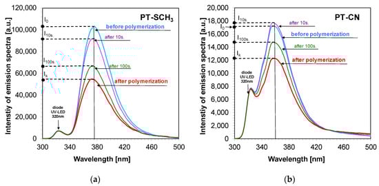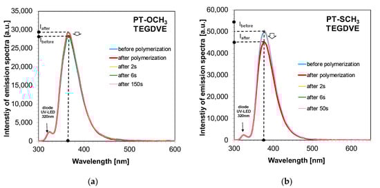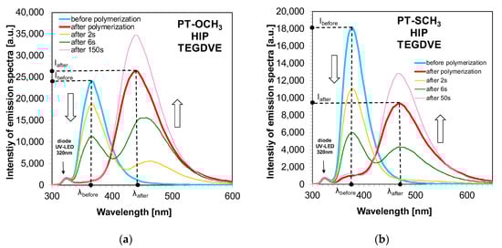 Changes in emission spectra during irradiation at 320 nm of the system containing the TEGDVE monomer without the addition of a HIP photoinitiator and (a) the PT-OCH3 sensor and (b) the PT- SCH3 sensor.