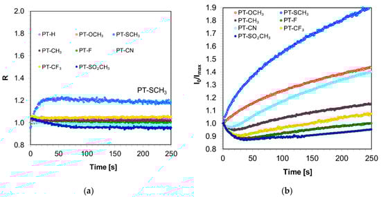 In consequence, the fluorescence intensity ratio (R) was applied as an indicator of polymerization progress. R was defined as the ratio of fluorescence intensity at a shorter wavelength (λ1) to the intensity at a longer wavelength (λ2), both located on the opposite sides of the fluorescence spectrum maximum. The monitoring wavelengths were determined individually for each probe from the probe fluorescence spectrum taken before monomer polymerization. Thus, the defined R values started from 1 and increased when the fluorescence spectrum shifted to shorter wavelengths or stayed constant when the spectrum did not shift. Figure 8a shows the effect of the measured free radical photopolymerization in real time, using the fluorescence intensity ratio (R) as progress indicator. It can be clearly seen that, depending on the type of substituents on the 2,6-diphenylpyridine moiety, the compounds either shifted or not shifted their fluorescence spectrum before and after photopolymerization, which is reflected in the ratio span between the uncured and cured states of the composition (Figure 8a). From among the probes studied, the sensor PT-SCH3 can be used to monitor the kinetics of the free-radical photopolymerization process using the increase of the ratio (R) with the progress of monomer polymerization. For the rest of the pyridine derivatives, this was impossible because the emission spectra of these compounds did not change position during the polymerization (Figure 8 and Table 4).