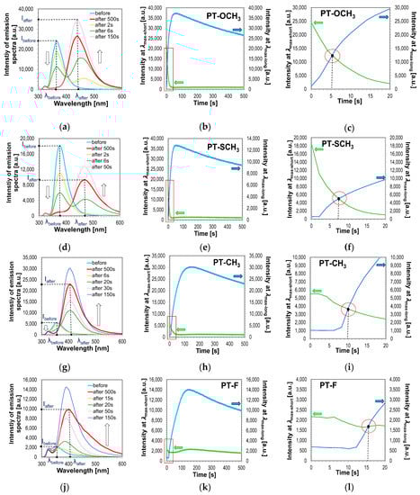 At this stage of the research, the question arose: is it possible to monitor the kinetics of the cationic photopolymerization process using the FPT method with pyridine derivatives? From a practical point of view, the compound used as a fluorescent sensor to track changes in polymerization kinetics should only be sensitive to changes associated with this process. Thus, for example, it should be sensitive to changes in polarity and/or viscosity in the entire monomer conversion range. Based on the recorded data, however, it can be seen that when the light is switched on to initiate the photopolymerization process, the fluorescence spectrum localised at the UV-A region of the sensors (PT-OCH3), (PT-SCH3), (PT-CH3) and (PT-F) decreases dramatically. Moreover, for these compounds, the simultaneous appearance of a completely new fluorescence band located in a more extended wavelength range is observed (Figure 9b,c,e,f,h,i,k,l).