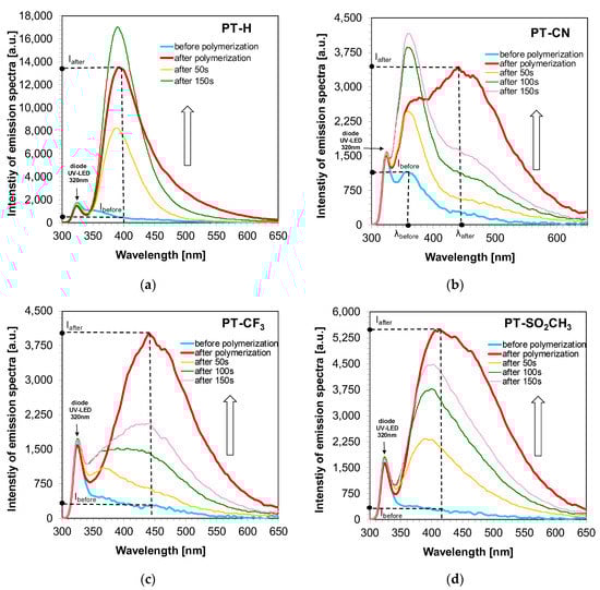 Changes of fluorescence spectra during cationic photopolymerization of TEGDVE monomer under irradiation 320 nm for (a) PT-H sensor; (b) PT-CN sensor; (c) PT-CF3 sensor; (c) PT-SO2CH3 sensor.