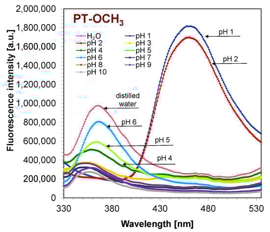 The emissions of the analysed compound 2,6-bis(4-methoxyphenyl)pyridine (PT-OCH3) in buffers at different pHs were recorded using the spectrofluorometer FluoroMAX 4Plus with MicroMax Plus (from Horiba, Kioto, Japan), which was used in standard 96-well plates (from Thermo Scientific).