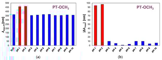 (a) Position of maximum fluorescence intensity for compound PT-OCH3 in in distilled water and pH in a range of 1–10. (b) Difference between the position of the maximum fluorescence of the PT-OCH3 compound in the reference sample (in distilled water) and the maximum of fluorescence in buffers at different pH.