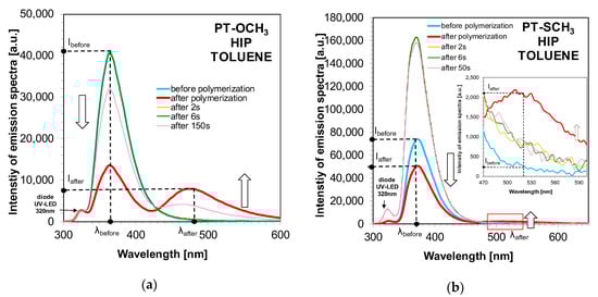 Changes in emission spectra during irradiation at 320 nm of the system containing the toluene, HIP photoinitiator and (a) the PT-OCH3 sensor and (b) the PT- SCH3 sensor.