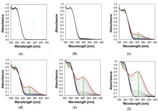 Photolysis of HIP/PT-OCH3 in acetonitrile upon exposure to LED @ 320 nm (1mW/cm2) in a molar ratio: (a) 0.5:1; (b) 1:1; (c) 5:1; (d) 10:1; (e) 20:1; (f) 30:1.