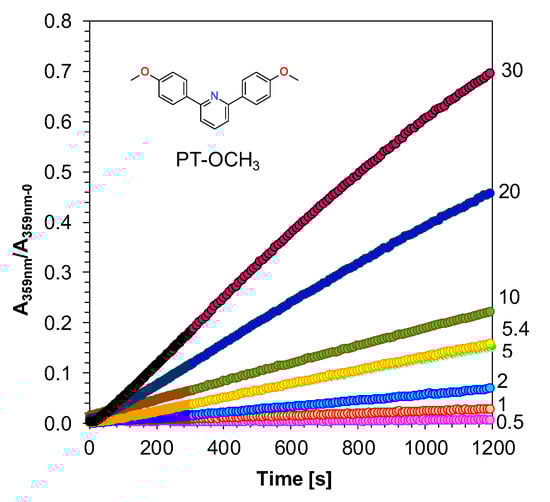 Steady state photolysis was carried out using the same spectrometer as for the absorption studies. The measurement consisted in the following: cuvettes with the 2,6-diphenylpyridine derivatives in acetonitrile were irradiated by UV-LED 320 nm (UVTOP315-BL-TO39, Roithner Laser Technik GmbH, Wien, Austria) emitting light with wavelength at λmax = 320 nm (~1 mW/cm2, current 20 mA), and by UV-LED-300 M300L4 (from Thorlabs Inc., Tampa, FL, USA) emitting light with wavelength at λmax = 300 nm (~26 mW/cm2, current 350 mA) for 20 min. The source of light was powered by a DC2200 regulated power supply (from Thorlabs Inc., Tampa, FL, USA). The UV-Vis spectra were recorded with the UV/Vis deuterium-halogen light source SL5 (from StellarNet, Inc., Tampa, FL, USA). The photolysis of 2,6-bis(4-methoxyphenyl)pyridine (PT-OCH3) derivatives in the presence of different amounts of iodonium salt (HIP) was determined with the same parameters over 20 min when exposed to UV-LED 320 nm with a maximum emission of 320 nm.