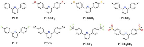 Eight 2,6-diphenyl pyridine derivatives, differentiated in terms of attached substituents, were tested as molecular fluorescent sensors. These were 2,6-diphenylpyridine (PT-H), 2,6-bis(4-methoxyphenyl)pyridine (PT-OCH3), 2,6-bis(4-methylsulphanylphenyl)pyridine (PT-SCH3), 2,6-bis(p-tolyl)pyridine (PT-CH3), 2,6-bis(4-fluorophenyl)pyridine (PT-F), 2,6-bis(4-cyanophenyl)pyridine (PT-CN), 2,6-bis[4-(trifluoromethyl)phenyl]pyridine (PT-CF3) and 2,6-bis(4-methylsulphonylphenyl)pyridine (PT-SO2CH3). The structures of 2,6-diphenyl pyridine derivatives are shown in Scheme 1. The synthesis pathways of the analysed derivatives are described in detail in the Supplementary Information, which also includes the results of NMR (Figures S1–S16), LC-MS analyses and visualization of the fluorescence of powders of these compounds (Figure S17).
