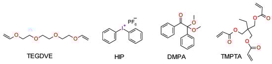 For the cationic photopolymerization, triethylene glycol divinyl ether (TEGDVE, from Sigma Aldrich) as a model vinyl ether monomer and diphenyliodonium hexafluorophosphate (HIP, from Alfa Aesar) as a photoinitiator were used. For the free-radical photopolymerization, ttrimethylolpropane triacrylate (TMPTA, from Sigma Aldrich) was used as a methacrylate monomer and 2,2-dimethoxy-2-phenylacetophenone (DMPA, from Sigma Aldrich) as a free-radical photoinitiator. The structures of monomers and model photoinitiators are shown in Scheme 2.