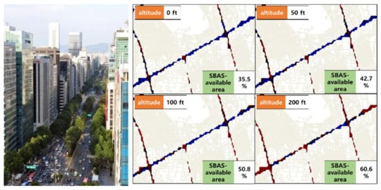 Assuming that the KASS GEO satellite will be located at the longitude of 143.5°, its elevation angle within the Korean flight information region (FIR) is only 42° to 45°, which implies that the SBAS can improve the drone’s navigation performance only when there are no obstacles blocking the GEO direction with an elevation of 45° or more. Simulation results based on three-dimensional building information from our previous work [22] demonstrated that drones flying at an altitude of 15 m or lower obtained benefits from the SBAS at 43% or less of the area of Gangnam-gu, Seoul, South Korea due to the high-rise buildings (Figure 4). Even if drones climb to an altitude of 60 m or more, it is not possible for them to obtain an SBAS-assured position (red dot in Figure 4, right) when they are flying in 40% of the urban area. The higher the latitude the drones are operating in, the less visible the SBAS GEO satellite is. At a latitude of 65°, a GEO satellite has an elevation angle of only around 17° at most, and at 75°, it is approximately 6° or less. Therefore, the condition of the line of sight direction to GEO would shrink the drone’s operating area.
