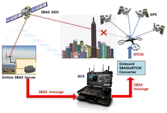 Whereas the full dependence on GEO improves the simplicity of the SBAS navigation equipment, there is a trade-off as it also limits the available area of drone operation. To enable the drone to perform its mission even in the GEO-invisible area, it is necessary to provide the SBAS message using a communication channel. As most drones performing missions already have a communication channel for control and data transmission from/to the ground control station (GCS), the complexity of the system does not increase due to the transmission of online SBAS messages. In addition, the SBAS data size of 250 bit per second is not large enough to affect the existing communication traffic.
