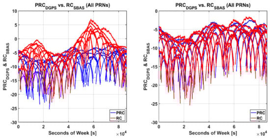 Although Equations (2) and (3) are theoretically equivalent, the left plot of Figure 6 shows that there is a big difference between PRC and RC. This difference was due to the offset between the clock bias estimated from the SBAS reference station network and that of the NDGPS RS. After removing this bias between the two systems using Equation (4), the sets of corrections became identical, as represented in the right plot of Figure 6. The root mean square (RMS) of errors between the two sets of corrections was less than 0.5 m.