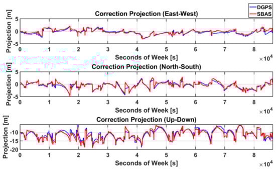 Using the relationship between the range domain and position domain correction based on DGPS-CP (correction projection) [28], we can compute the position corrections () by DGPS and SBAS using Equation (5).