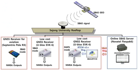 To describe the strategy to improve the accuracy of drones by the online SBAS service, this study considers the most widely deployed DGPS receiver, the U-blox 6 series module. This module supports both DGPS and SBAS, and we can confirm that their correction has been applied to the receiver through a flag of the position output, such as the National Marine Electronics Association (NMEA) data [27]. SBAS augmentation is possible only by receiving the SBAS L1 frequency signal transmitted from the GEO, whereas feeding the SBAS message to the receiver through its input port is not a possibility. The only way to enable DGPS through the input port is feeding Radio Technical Commission for Maritime Services (RTCM) correction. Thus, it is impossible to apply the online SBAS presented above as it is.