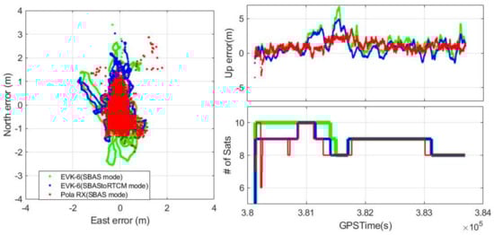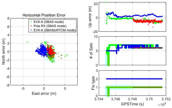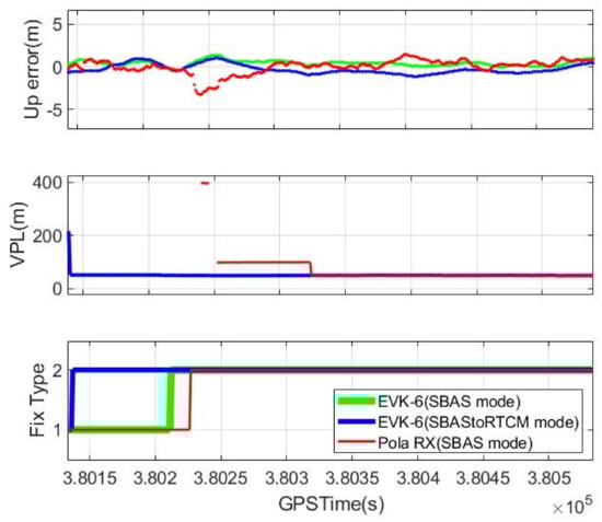 Figure 11 shows the effect of the quick initialization mode. It represents the vertical errors, their VPLs, and the fix types from the NMEA outputs of the three receivers during the initial 400 s. The fix type, which indicates stand-alone for 1 and DGPS for 2, denotes when the SBAS reception was completed. It took 75 and 90 s for the EVK-6 and Pola RX to switch to the DGPS mode by receiving the L1 SBAS signals from GEO, whereas the EVK-6 with the onboard module acquired its DGPS solution just 1 s after requesting the quick initialization mode. The vertical errors of the other two receivers were not large despite of the stand-alone mode, and the presumed reason is that much of their error was mitigated by error models such as the Klobuchar and tropospheric models. This assumption is reasonable because the position errors of EVK-6 in the SBAS mode became the same as those of our system immediately after switching to the DGPS mode. In the case of Pola RX, the errors increased immediately after its mode changed to DGPS, because Pola RX did not obtain SBAS messages for all the visible satellites at the time, and only six satellites among them were used for the DGPS positioning, as shown in Figure 9.