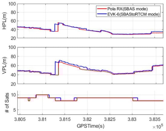 The HPL and VPL calculation modules for EVK-6 were added to the experimental configuration in Figure 8, and our calculated PLs were compared with the values provided by the Pola RX receiver. Figure 10 shows the result of this comparison, and the difference between the PLs from the two systems was so small that their RMSs were only 1.02 m horizontally and 2.16 m vertically. As is well known, EVK-6 itself does not have any function to calculate the PL, and thus it is not shown in Figure 10.