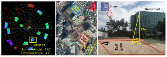 We constructed a real dynamic configuration in which a drone could not receive the SBAS signal from the GEO due to obstacles such as nearby buildings. The PRN 137 GEO, for which Japan’s MSAS signal is receivable in the Korean region, was visible from the azimuth of 152° and elevation of 43° in Seoul. A student hall in a six-story building was located in the southwest of the sports ground of Sejong University, where a drone was flying for the dynamic test. As the building’s height was 22 m, the drone placed on the ground horizontally 5 m apart from the building could not see the PRN 137 GEO, as shown in Figure 12. A GNSS antenna for the online SBAS server, constructed on the rooftop of the Chungmu-gwan building, was located 320 m away from the drone test area.