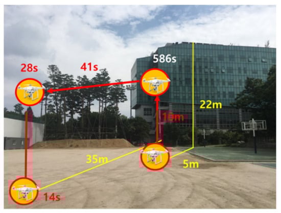 To conduct a test on the situation where the SBAS signal was denied due to a nearby building, we set a scenario in which a drone took off from the ground near the student hall building, ascended to an altitude of approximately 10 m, moved to the SBAS-visible area, and then landed on the ground as represented in Figure 14.