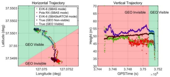 The test results in Figure 16 show how our proposed system improved the drone’s navigation performance in terms of accuracy when the SBAS signal was denied by the actual building. Our developed system immediately changed its mode to DGPS and provided the error-mitigated positions, while the other EVK-6 in the SBAS mode eventually failed to provide DGPS position despite moving to the point where the GEO satellite was visible. For the receiver, 68 s was not enough time to accumulate the SBAS message transmitted at a low rate of 250 bps and generate a correction from them. The RX did not even provide a stand-alone position when it was near the building for the first 317 s.