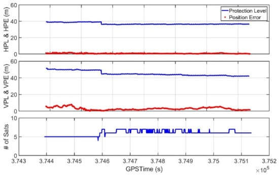 Our suggested system also provided proper PLs with the error-mitigated positions to ensure the level of trust to be placed on the solution. It could calculate the PLs as soon as the power of the receiver was turned on, which was confirmed from the static test result. Figure 17 shows that HPL and VPL were provided throughout the drone operation, and these values properly bounded the position errors.