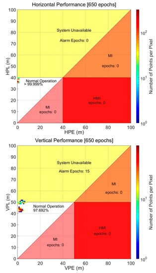 The VPLs at the beginning of the test, when the drone was flying near the student hall building, slightly exceeded 50 m and did not meet the APV-I requirement. However, after the initial 15 epochs, both HPLs and VPLs were smaller than the horizontal and vertical alert limits of 40 and 50 m, respectively, through the rest of the test. Therefore, the APV-I availability of this system was computed as 97.692% because the APV-I conditions were met for 654 epochs out of a total of 669 epochs, as shown in Figure 18. During the session, there were not found any misleading information (MI) hazardous misleading information (HMI) events.