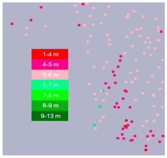 For pile depth monitoring, we use different colors to display different pile depths in real time, where the unit is a meter. According to different depth ranges, all monitoring stone columns are given corresponding colors, which are indicated by the following color classification: The depth of 1–4 m is marked with red, 5–6 m with pink, and 9–13 m with green, such that the construction situation is clear and intuitive. Project managers can remotely grasp and scientifically adjust the project construction schedule, as well as rectify the weak areas detected in the system duly, in order to ensure the project quality. The monitoring effect of pile depth is shown in Figure 3.