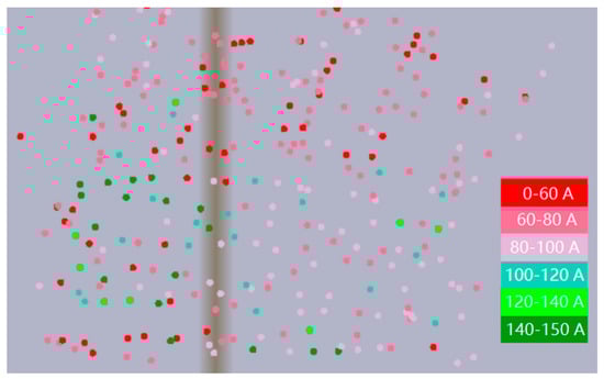In the bearing layer current monitoring, all monitored stone columns are given corresponding colors according to the current range of different load layers and marked by color. For example, a red solid circle is used for pile points in the 0–60 A range, a pink solid circle is used for pile points in the 80–100 A range, and a green solid circle is used for pile points in the 140–150 A range, in order to convey the current distribution of all construction stone columns in real time. An example is shown in Figure 4.