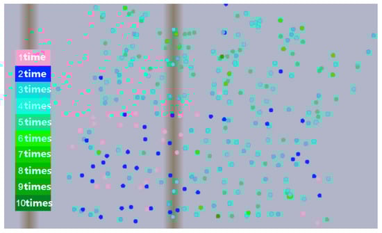 In reverse insertion time monitoring, all monitored stone columns are demonstrated with corresponding colors, according to different times of reverse insertion, which are indicated by color; for example, one reverse insertion is indicated with a pink solid circle, and 6–10 reverse insertions are indicated by green solid circles. In this way, we can obtain a real-time understanding of the current reverse insertion times of all construction stone columns. An example is shown in Figure 5.