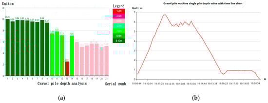 The software can realize point selection, box selection, or statistics of monitoring information of the stone column machine in accordance with the period, number of stone column machines, and other conditions. Queries or statistics according to different conditions can be used to obtain the corresponding attribute information; as shown in Figure 6a, where we selected 21 pile points on the GIS map, queried the pile depth of each pile, and drew a column chart. From the legend, it can be seen that, for different pile depth ranges, the color is different. When selecting a pile point on the GIS map, relevant parameter information of the pile point can be queried, such as multiple pile points selection; as shown in Figure 6b, where the variation of depth of a single stone column was queried over time. Similarly, other monitoring parameters can also be queried and statistically analyzed. All queries, statistical property sheets, and statistical graphs can be exported to Excel.