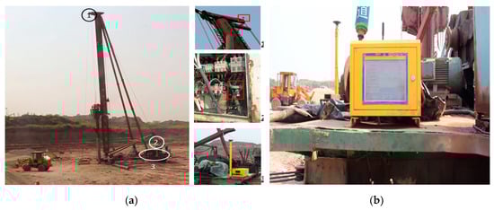 The construction site piling was as shown in Figure 7a, where installation position 1 is the laser sensor, position 2 is the current transformer, and position 3 is the Beidou positioning double antenna and main control box. The wiring of the machine body does not affect the normal operations of the vehicle, and fixing of the module components avoids destructive operations on the vehicle, such as drilling and welding of the machine body. The display of construction technical parameters of pile driving obtained on-site are shown in Figure 7b, and some of the data intercepted for comparative analysis with the on-site construction records are listed in Table 2.