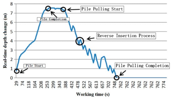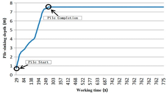 In Figure 8, the working time and pile sinking depth at the beginning and completion of the pile-sinking are shown. The construction started at 29 s and the final pile sinking depth of 7.54 m was reached at 263 s. Therefore, the whole pile sinking process lasted 4 min.
