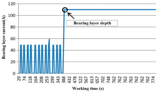 Another index which is used to judge whether the pile is completed is whether the current of the bearing layer reaches a stable value. During the actual construction, due to the vibration of the stone column and field disturbances, the bearing layer current generated by the current sensor during the construction (0–394 s) fluctuates. It fails to reach a stable value, indicating that the sinking pile has not been completed. Finally, at 394 s, the current of the load-bearing layer reaches a stable value (109.83 A) which does not change with time, indicating that the pile-sinking process had completed, as shown in Figure 9.