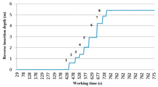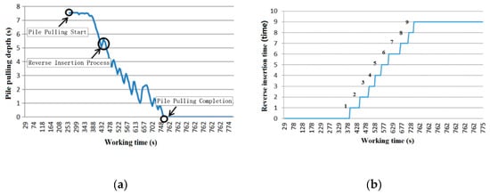 The pulling speed should be uniform and controlled within 1 m/min, the depth of reverse insertion per 1 m of tube should not be less than 30 cm at 2–6 m from the surface, and the depth of reverse insertion should be no less than 50 cm. As can be seen from Figure 10a, after the pile was completed, the pile was pulled up at a uniform speed (the slope is the speed of pulling the pile), after some time at the original depth, until the construction process was completed. The curve reflexes represent a back-stepping process, as shown in Figure 10b. The change condition of reverse insertion times (as time changes) can be observed.